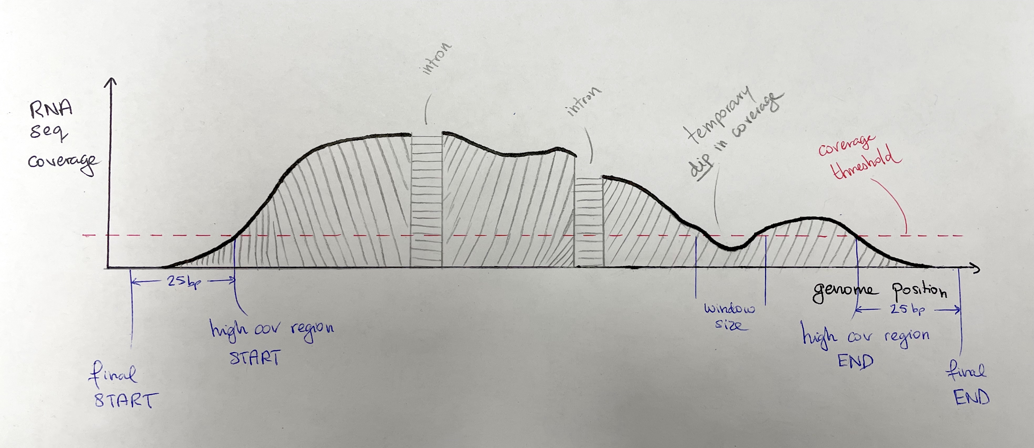 - If the coverage remains low for a set number of positions (i.e. the user-defined 'window size'), it will then mark the last known high coverage position as the end of the high coverage region.